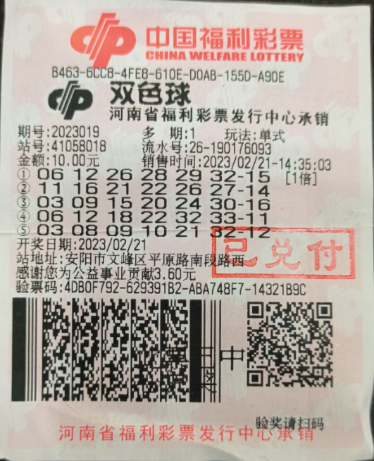 2月21晚,福彩双色球第2023019期开奖,当期全国共开出7注一等奖,单注奖金830万元,河南安阳彩民收获其中1注。