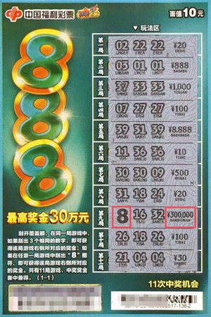 她说道:“刮开第一张,没有中奖,紧接着我刮开第二张,在玩法区的第九局游戏中出现了‘8’图符,我赶紧刮开右边对应的奖金,‘¥300,000’的图符浮现在眼前,我突然愣住了,马上找销售员帮忙确认。”