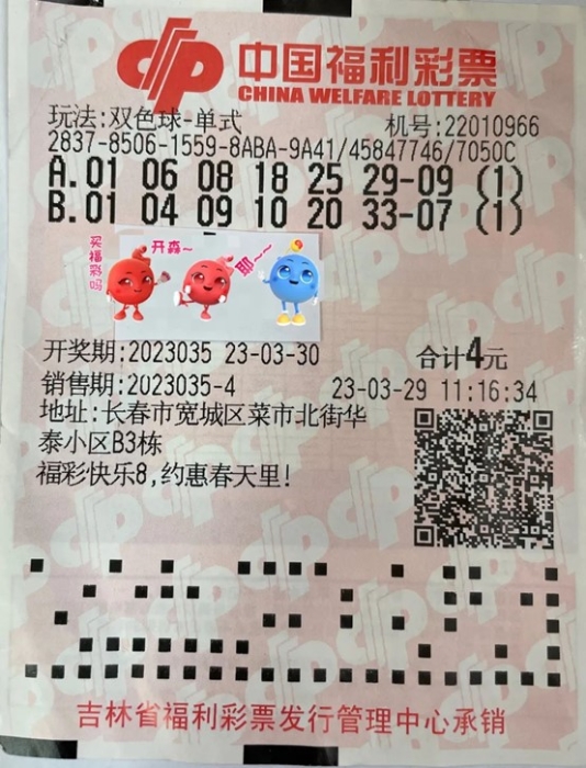3月30日晚,中国福利彩票双色球游戏进行第2023035期开奖。当期双色球红球号码为01、04、09、10、20、33,蓝球号码为06,吉林省当期中出3注二等奖,单注奖金23万多元!