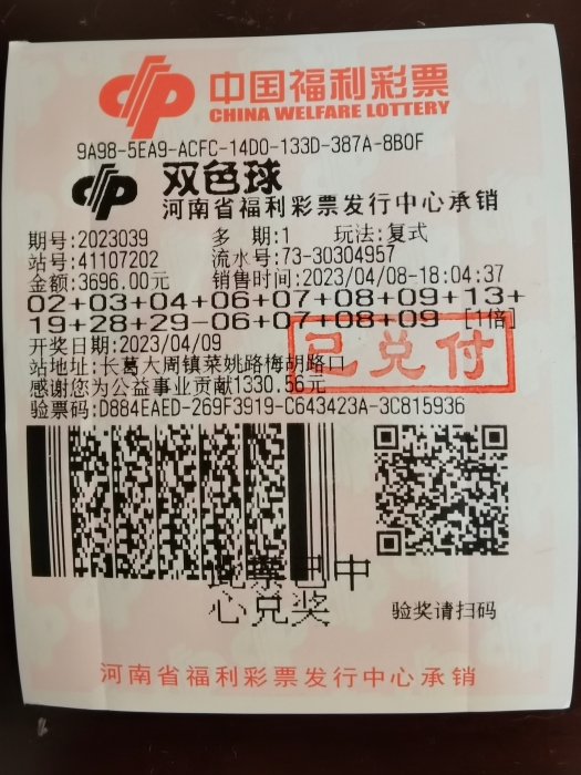 4月9日晚,双色球第2023039期开奖,全国共开出5注一等奖,河南购彩者幸运收获其中1注,中奖彩票出自许昌长葛大周镇福彩41107202投注站,为一张复式彩票,收获奖金943万元。