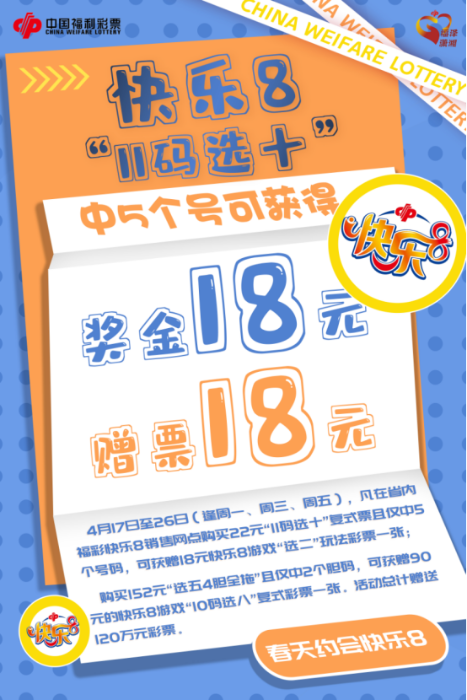 4月17日至26日,逢周一、周三、周五开展“春天约会快乐8”营销活动(即快乐8游戏2023097期、2023099期、2023101期、2023104期和2023106期,共计5期)。