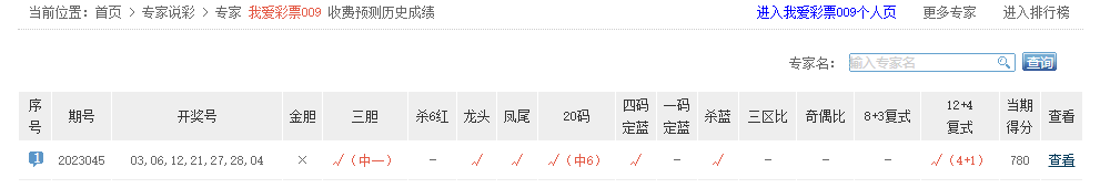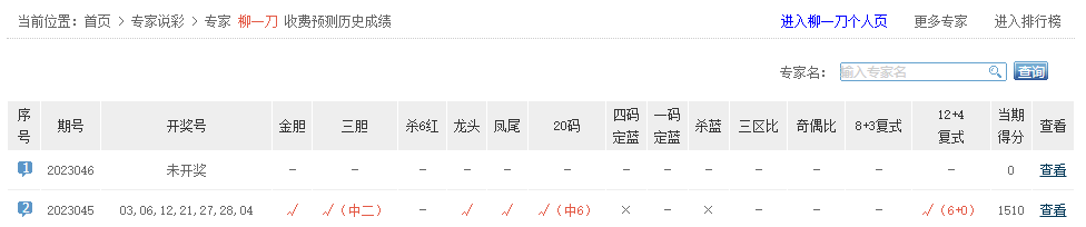 柳一刀复式12+4命中6+0;定胆宝典、天空之镜、大彩总在风雨后等专家同中6红。