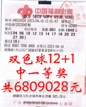 4月16日双色球第2023042期开奖,当期全国共中出10注一等奖,单注奖金为665万多元。其中花落广州的1注一等奖由白云区44010034站中出,中奖彩票为一张1848元的“12+1”复式自选票。由于中奖彩民采用了复式投注,该张彩票除中得1注一等奖665万多元外,还额外中得多注固定奖,总奖金为680多万元。