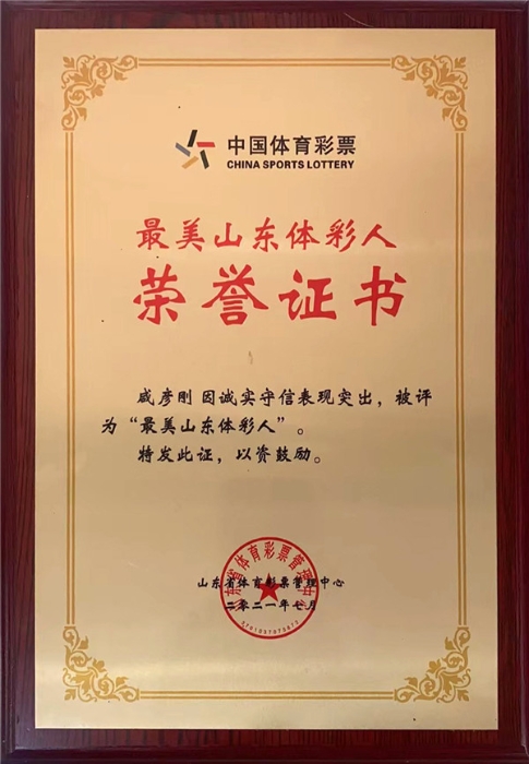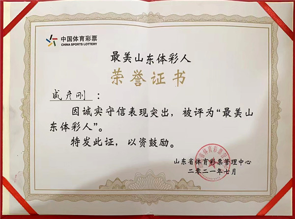听说咸彦刚被山东省体彩中心评为2021年度“最美山东体彩人”、诚实守信模范,和咸彦刚说起这事,咸彦刚谦虚地说:“我做了应该做的事情,没有想到山东体彩给了我这么高的荣誉!”咸彦刚说,在2021年2月1日23时50分,他在店里兑奖时突然发现即开票的兑奖系统有问题,他立刻着急了,“这不是小事,兑奖技术出现故障影响可太大了!”没有任何犹豫,他立即抓起电话向上级汇报情况,接到报告后,临沂分中心工作人员立即上报省体彩中心技术部,省体彩中心技术部第一时间开展应急处置,上报总局体彩中心并协调印务公司和网点进行测试、分析。层层上报、层层等待,最终,该技术故障于2月2日凌晨01:52得以排除,恢复正常兑奖,咸彦刚也终于放下心来,拍着胸膛一个劲地说着“幸好,幸好”。虽然这个事情是偶发事情,但从这件事情中彰显了咸彦刚作为一名体彩从业者强烈的大局观念和风险防范意识。咸彦刚也荣获“最美山东体彩人”称号,受到山东省体育彩票管理中心的表彰奖励。