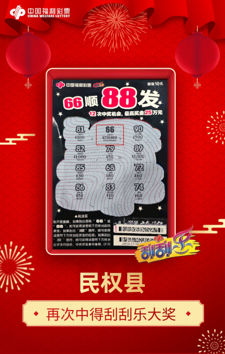 近日,位于商丘市民权县41640316号投注站传来喜讯,一00后(已成年)小伙喜中刮刮乐“66顺88发”大奖25万元。