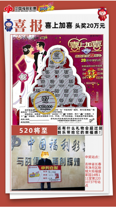 5月9日,通化市东昌区棉纺厂第22050574号福彩销售网点的一位购彩者,刚把2万元“哦耶”大奖抱回家,同一天,吉林省长春净月区新城大街福盛家园14栋111室第22010737号福彩销售网点又传喜讯,该站幸运彩民王先生(化姓)中出“喜上加喜”20万元大奖!
