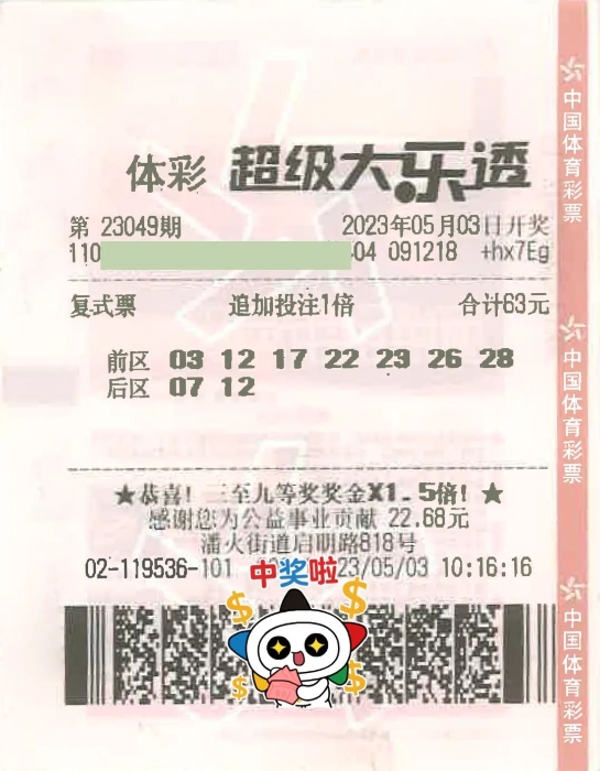 5月3日,体彩大乐透第23049期开奖,我省宁波中出1注大乐透追加一等奖(含派奖),符合派奖条件,额外获得派奖奖金751万元,单票收获奖金共2554万元。幸运儿周先生也是自今年超级大乐透10亿大派奖活动启动以来,我省第一位斩获派奖奖金的大乐透一等奖中奖者。