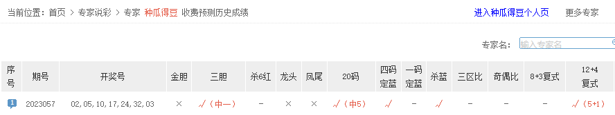 种瓜得豆复式12+4命中5+1;三葬、渐冻彩迷、乐小星、学会幸福、Dixon、彩精彩、超彩人生等专家同中5红1蓝。