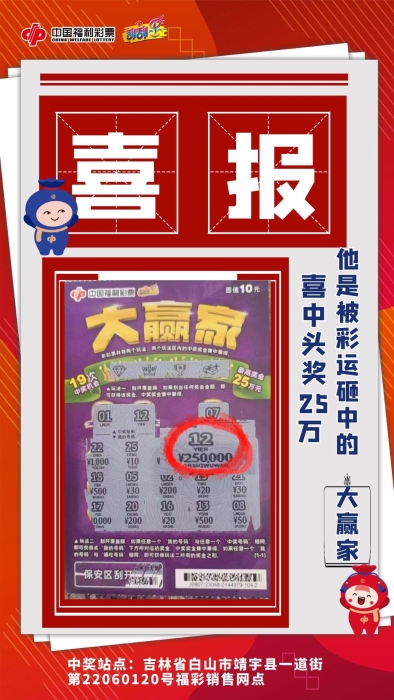 同一天,吉林省白山市靖宇县一道街第22060120号福彩销售网点再传好消息,购彩者赵先生(化姓)运气爆棚,喜中福彩刮刮乐“大赢家”25万元头奖!