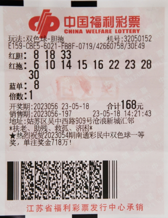 5月18日晚,双色球游戏第2023056期开奖,当期全国一等奖中出10注,单注奖金为647万余元。当期江苏省喜中的1注一等奖来自于苏州市,幸运彩民对上期投注 “3胆9拖”的红球胆拖票进行了复制,花费了168元,销售日期为5月18日14时21分43秒,幸运站点为苏州市姑苏区吴中西路909号沧浪新城汇邻、编号32050152福彩销售网点,除了中出1注一等奖外,还中出三等奖18注、四等奖45注、五等奖20注,总计收获奖金654万多元。