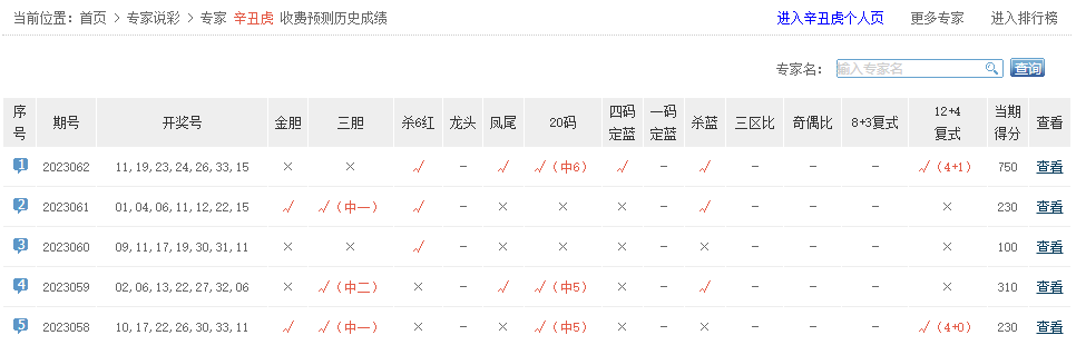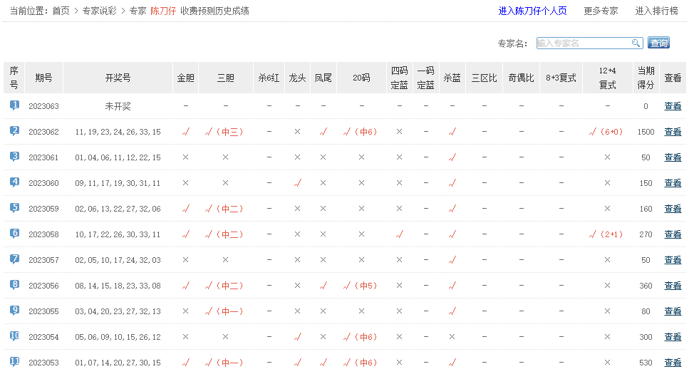 陈刀仔、小金人、智多星余敬复式12+4命中6+0;天山翠、沉稳大师、一起中奖吧等专家同中6红。