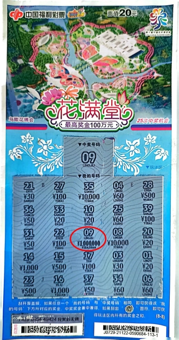 据了解,当天中午,该幸运女士与丈夫来到万达商场逛街,看到三楼摆放的福彩即开票自助终端机,便购买了10张“花满堂”刮刮乐,当刮到第2张的时候,好运降临:玩法区出现了与中奖号码一样的“09”图符,对应的奖金却是最高奖100万元。