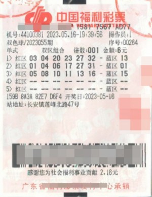5月16日中国福彩双色球2023055期开奖,当期双色球一等奖1注独中,单注奖金为 1000万元。这注全国独一无二的大奖花落东莞市长安镇莲峰北路47号第44100381号销售网点,中奖彩票是一张6元单式机选票。