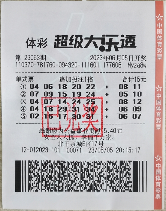 6月5日,体彩超级大乐透第23063期前区开出号码“04、18、29、31、34”,后区开出号码“06、09”。当期全国共开出6注一等奖,其中1注1216万余元(含540万余元追加奖金)的追加投注一等奖花落潍坊。中奖票是一张15元的单式追加票,大奖得主小徐是一位95后小伙,家住潍坊城区。领奖时小徐表示:“这几组号码是用我定亲时候的日期编的,从4月份就一直坚持买,但是我没想到真的中了一等奖!”