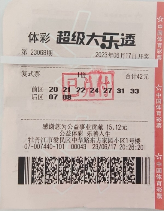 6月17日,体彩超级大乐透第23068期一等奖开出7注1000万,其中一注花落黑龙江,出自牡丹江市爱民区中华路东方家园小区1号楼、编号为2307007440的实体店。