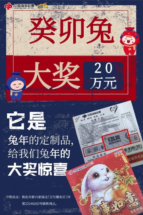 同样是6月25日,福彩刮刮乐又出大奖了!来自敦化市新兴家园北门2号楼东5门市第22240202号福彩销售网点的幸运购彩者周先生(化姓),喜中“癸卯兔-萌兔送彩”20万元大奖!