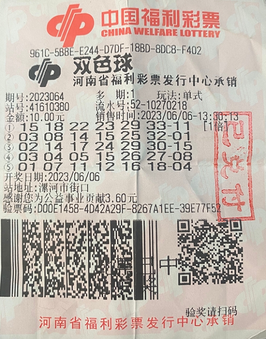 数据显示,6月初,双色球第2023064期开奖,河南购彩者收获9注一等奖,其中1注花落漯河,也就是被吴先生所中,出自漯河市源汇区大刘镇街口41610380投注站,为一张单式5注10元票,喜中一等奖589万元,再现大奖福地。