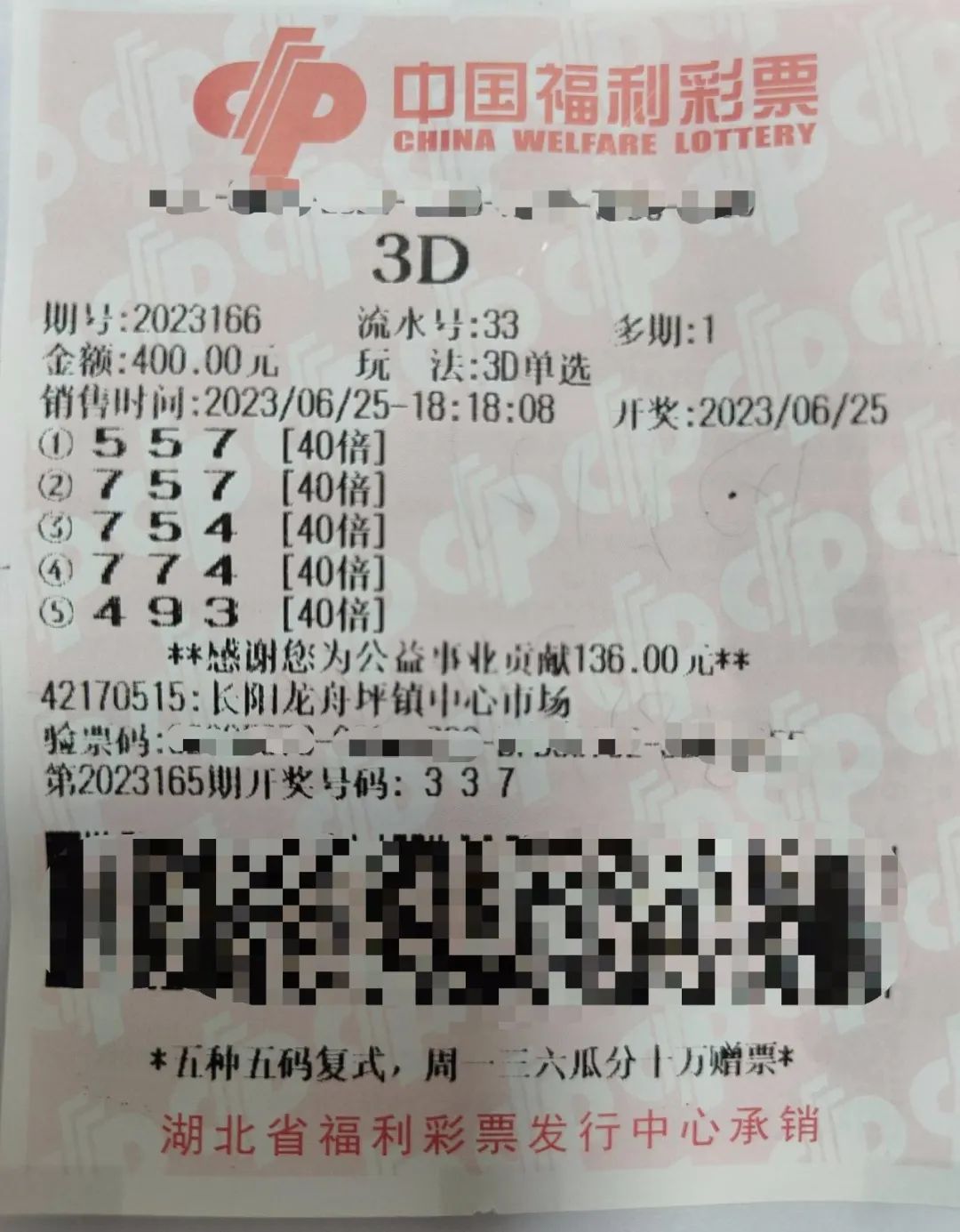 6月25日晚,中国福利彩票3D游戏第2023166期开奖,开奖号码为“557”,这下可把宜昌市长阳县龙舟坪镇的王先生(化姓)给高兴坏了,原来,他当期投注了40倍“557”,收获奖金41600元。