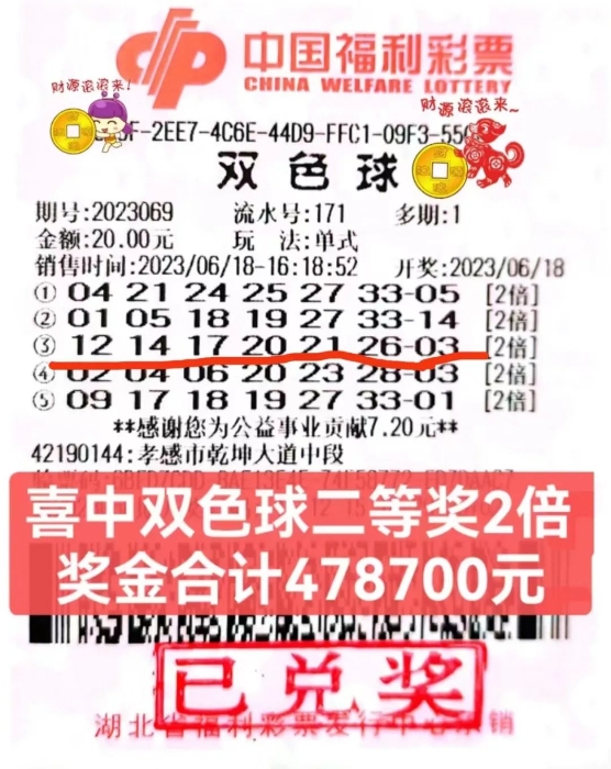 双色球第2023069期,孝感乾坤大道42190144销售站一彩友中得2注二等奖,奖金47.87万元。