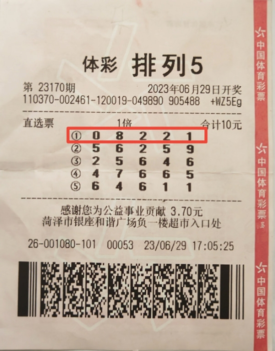 6月29日,菏泽一位大姐在和谐银座逛超市时顺便“机选”投注一张排列5,其中一注号码幸运击中当期一等奖,收获奖金10万元。