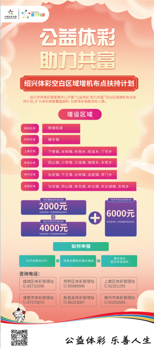 为进一步完善绍兴市体彩渠道建设,不断优化门店布局,填补体彩空白区域,自即日起绍兴市体育彩票管理中心开展“公益体彩 助力共富”空白区域增机布点扶持计划,扩大体彩销售覆盖面积,拉新体彩销售目标人群,为打赢“渠道保卫战”奠定坚实基础。