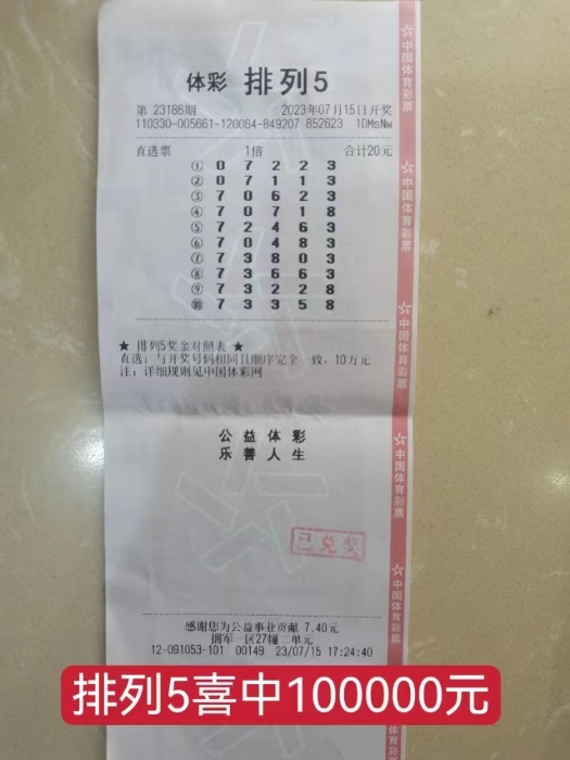 7月15日,体彩“排列5”第23186期开奖,位于义乌市拥军一区27幢二单元的3312091053体彩实体店中出1注”排列5”,单票奖金10万元。