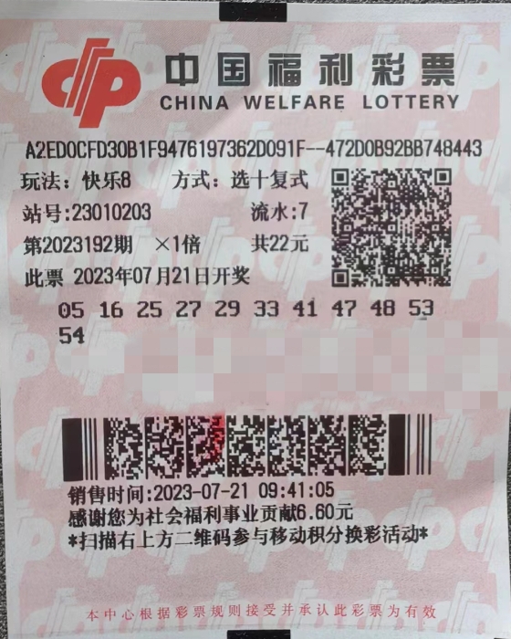 7月21日,“快乐8”游戏第2023192期开奖,哈尔滨购彩者喜中快乐8“选十中十”大奖。该大奖出自哈尔滨市第23010203号福彩销售场所,中奖彩票为一张面值22元的选十复式票,命中当期“选十中十”1注,单注奖金500万元。