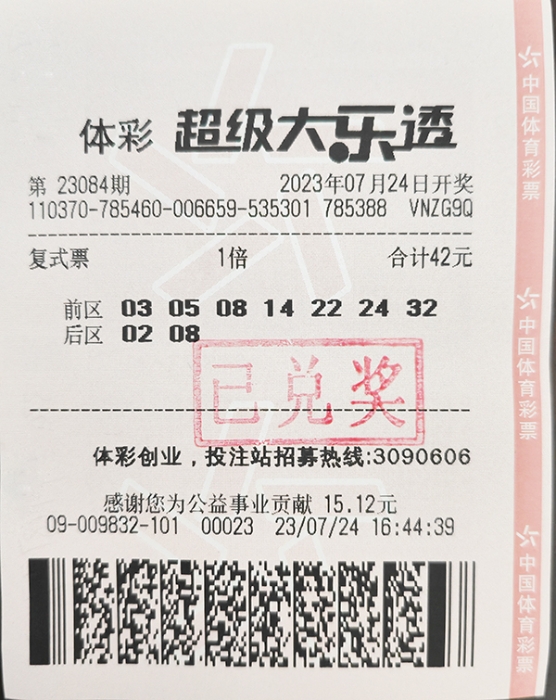 7月24日,体彩超级大乐透第23084期开奖,本期开奖号码为:03、05、08、24、32+07、08,来自枣庄市峄城区的王先生(化名)凭借一张7+2的复式票,揽获二等奖1注,五等奖10注,八等奖10注,奖金共计104087元。