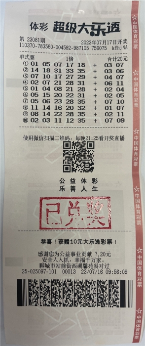 2023年7月17日,体彩大乐透第23081期开奖,开奖号码为前区05、06、23、28、35,后区07、10。当期聊城购彩者好运爆棚,“一炮双响”,喜中2注一等奖,单注奖金720万元。分别由东昌府区站前街西湖馨苑小区对过体彩店以及站前街与东昌路交叉口东北角体彩店中出。