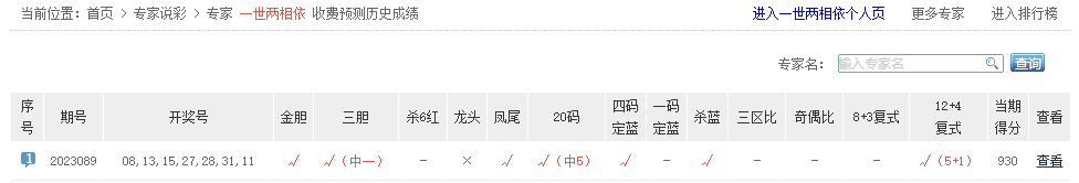 一世两相依、幸运大神、胆胆相依、身如静湖、中秋月圆、彩民聊彩复式12+4中5+1;三十不惑、大眼瞪小眼等专家中5红1蓝。