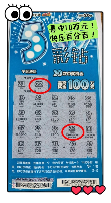 中奖彩民李阿姨(化姓)平时比较喜欢玩刮刮乐,每次路过彩票站时都会选择性地刮上几张,这天,李阿姨来到22040079号福彩投注站看见展示柜里的一本“5彩钻” 闪闪发光!让自己有了想刮开的冲动,随即便决定整本买下,在刮大概十来张的时候李阿姨脸上洋溢了开心的笑容。李阿姨说:“我也没想到刮着刮着"¥100,000"就映入眼帘!当时还以为自己眼睛花了,这么多个0看了好多遍,才确定是10万元!”
