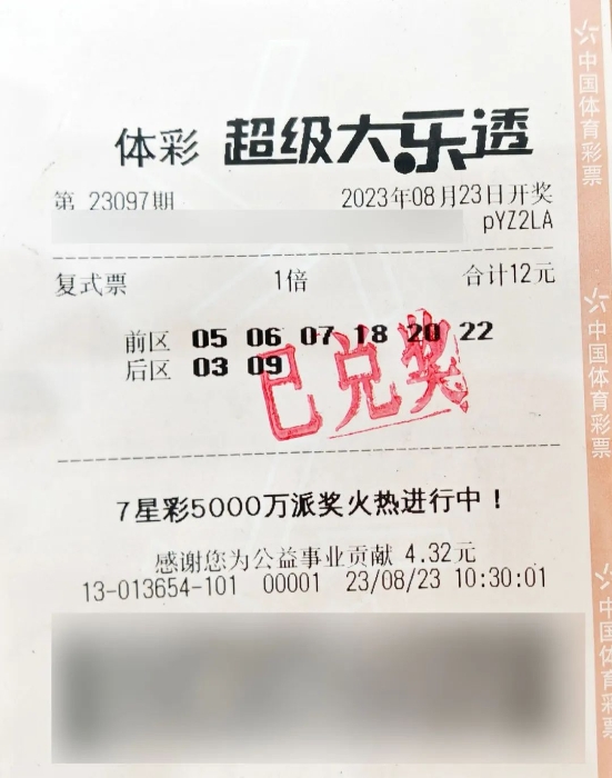 8月23日,体彩超级大乐透第23097期前区开出号码“06、07、18、20、22”,后区开出号码“03、09”。本期全国销量为2.83亿元,为国家筹集彩票公益金1.02亿元。