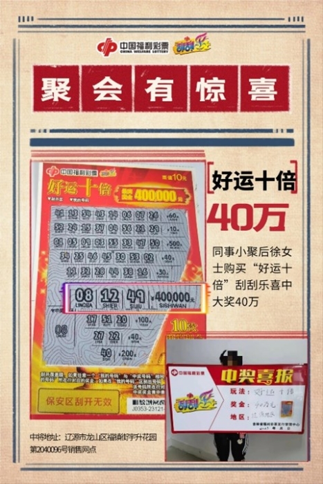 9月21日,吉林省双喜临门,松原市宁江区昆江街516号的第22070371号福彩销售网点刚中出10万大奖,辽源市龙山区福镇街宇升花园第22040096号福彩销售网点又传喜讯,该站一彩民运气爆棚,喜中福彩刮刮乐“好运十倍”40万头奖!