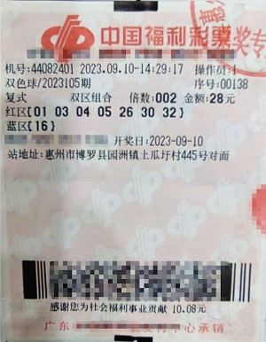 9月10日晚,双色球游戏第2023105期开奖,当期全国共中出3注一等奖。其中,花落广东的2注为一张彩票所中,中奖彩票是一张2倍投注的“7+1”小复式票,投注额为28元,中奖总奖金高达2003万多元,这是惠州今年中出的首个千万大奖。该大奖彩票在惠州博罗县园洲镇土瓜圩村44082401销售站点售出。