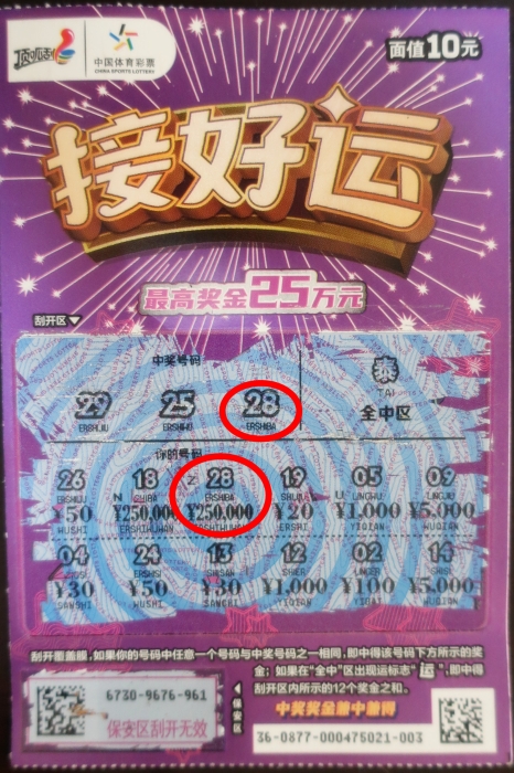 据了解,张先生平时接触彩票并不多,偶尔买几张顶呱刮即开票娱乐一下。张先生介绍说,他在国庆节刚刚订完婚,这几天一直沉浸在幸福之中,10月4日他在外出办事时路过一家体彩店,便想着进店试试运气,在销售员推荐下选了几张10元面值的即开新票“接好运”,刮开前几张都没有中奖,就在最后一张的时候,中奖号码为25、28、29三个号码,当刮到“你的号码”第三个28和中奖号码28完全匹配,下面的中奖金额赫然写着¥250000。“我当时真的不敢相信,经销售员再三确认我方才确信自己真的中了大奖,当时投注站的销售员比他还激动,开心得快要跳起来了!”谈起当时中奖时的情景,张先生依然难掩激动之情。