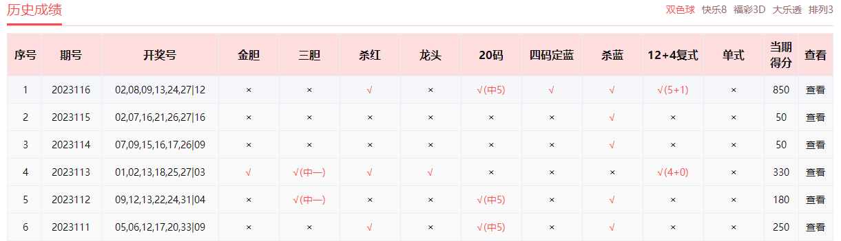 慧远12+4中6+0;联名彩神、瓦妮达我爱你、白道长、九宫算法、人工智慧、老张看彩中6+0。