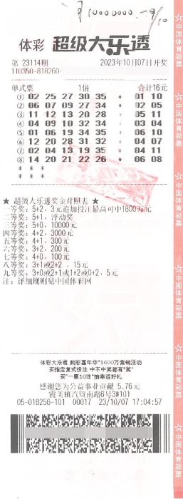 10月7日晚,超级大乐透第23114期开奖,前区开出号码“02、25、27、30、35”,后区开出号码“01、10”。福建泉州一购彩者喜获一等奖1注,金额1000万元。
