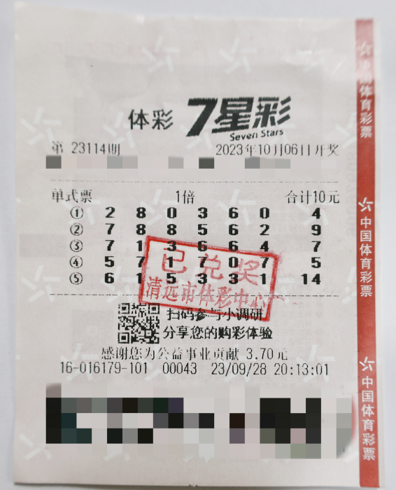 10月6日,中国体育彩票7星彩第23114期开奖,开奖号码为“6 1 5 3 3 1 + 14”。此期广东清远市清新区建设南路7号103卡4416016179实体店中出1注一等奖。中奖者小王(化名)凭借一张5注10元票中得500万元,为清远贡献税收100万元。