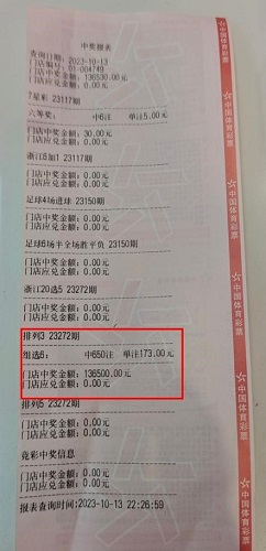 10月13日,体彩“排列3”第23272期开奖,开出的中奖号码是:4、1、9,位于杭州市花园岗街181号崇安商业广场南门,一家9月新开张的编号为3301004749体彩特色实体店传来喜讯,该店的一名购彩者中得“排列3”当期“组选6”650注,收获奖金136500元。