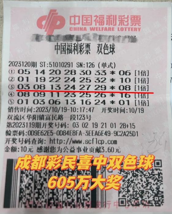 10月19日晚,双色球第2023120期开奖,全国开出一等奖15注,四川彩民收获1注,该注出自四川省成都市双流区华阳镇富民路一段123号,第51010291号销售网点,奖金合计 605万余元。