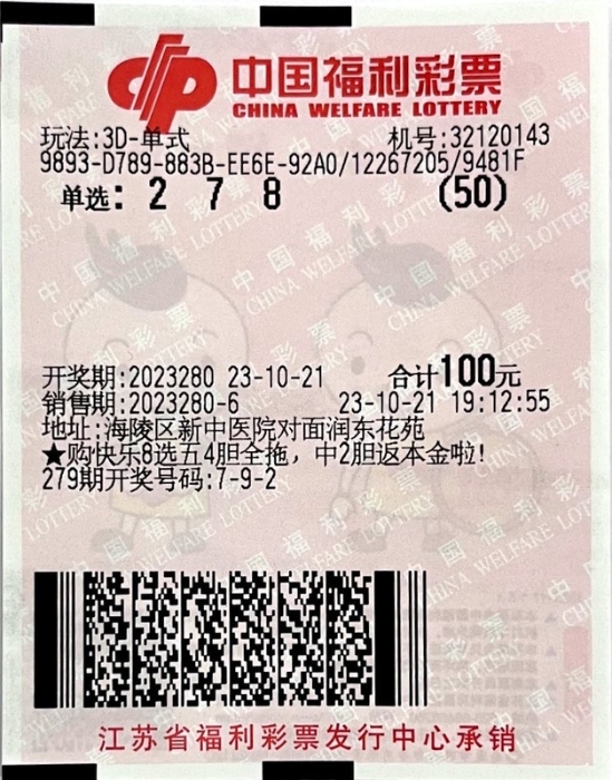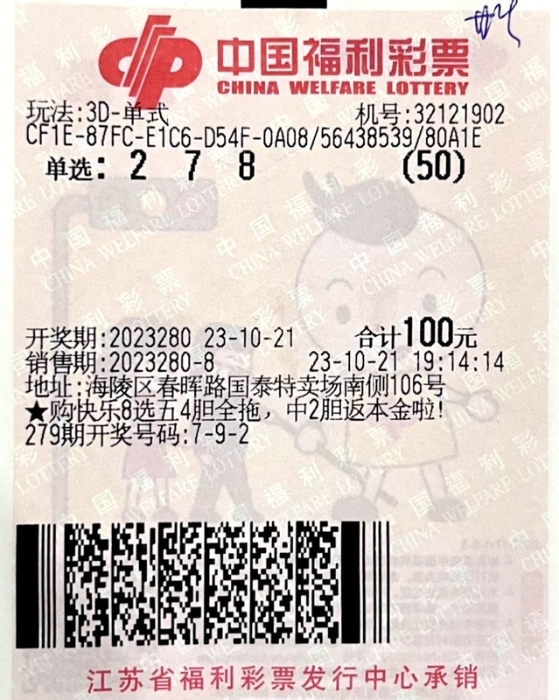 10月21日,中国福利彩票3D游戏第2023280期开奖,当期开奖号码为:2、7、8。泰州一位幸运彩民喜中单选100注,两张票分别购买于润东花苑的第32120143号福彩投注站和春晖路国泰特卖场南的第32121902好福彩投注站,奖金高达10.4万元。
