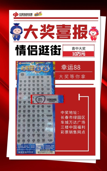 10月29日,吉林省长春市绿园区车城万达广场三楼中国福利彩票传来喜讯,一对年轻情侣,幸运刮出福彩即开票“幸运88”10万元大奖!