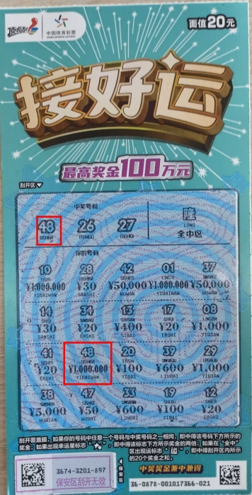 大奖得主小李是一位千禧年出生的小伙子,今年大学毕业刚参加工作几个月。平时周末或者下班后的时间,小李经常和朋友一起逛街游玩刮彩票。小李表示,对他来说刮彩票是一种放松身心的游戏,既能解压娱乐还能献一份爱心做公益,是一个两全其美的小爱好。聊起中奖的情景,小李特别兴奋:“当时买了一整本顶呱刮,我跟朋友就坐那慢慢刮,没想到刮着刮着就出现了大惊喜!”为小李赢得大奖的中奖票是一张面值20元的“接好运”,票面刮出了中奖号码“48”,对应中奖金额“¥1000000”,就这样中了100万元大奖!