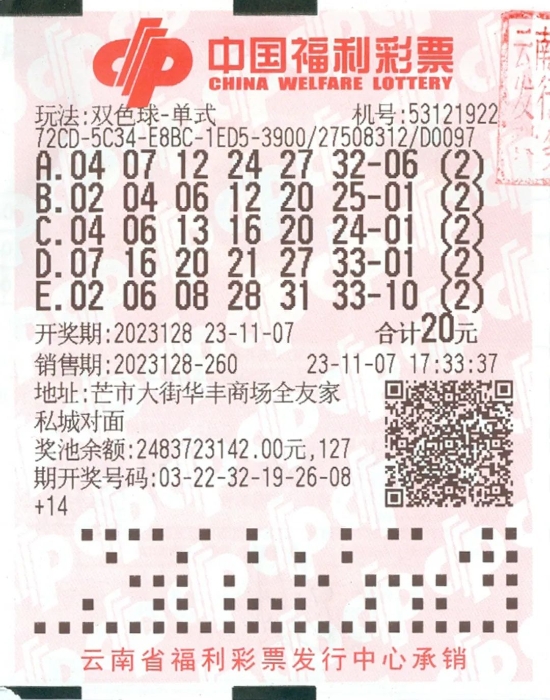 双色球2023128期,德宏州芒市大街华丰商场全友家私城对面53121922号销售网点中出2注双色球一等奖。中奖彩票是一张5注单式票,并进行了2倍投注,中奖金额合计1567万余元。