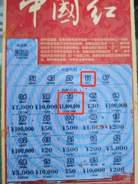 前面几张都没有中奖,后面陆陆续续地中出了几个小奖,当刮到最后几张的时候,其中一张票面上出现了一个中奖数字“11”,小陈慢慢刮开下方的中奖金额,“100万!”小陈兴奋地喊出了声,销售员和一旁的其他购彩者也围了上来,纷纷向小陈道喜。
