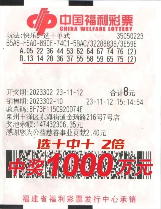 11月12日晚开奖的福彩快乐8游戏第2023302期,全国中出2注选十中十,单注奖金500万元。这2注大奖都被福建购彩者斩获!大奖均花落泉州市丰泽区东海街道金琦路216号7号店的福彩35050223投注站,中奖彩票是一张2倍投注的单式票,喜获总奖金1000万元。