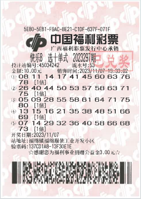 11月7日下午,王先生像往常一样来到45034242号投注站购彩,买了双色球彩票后,再让销售员随机打5注快乐8“选十”玩法彩票。“小王,你看这5注随机号码如何,需要再换吗?”销售员问道,王先生回复:“不用换号码了,中不中奖也没关系就当奉献爱心,中奖的话也是自己好运来了。”于是,销售员便打出那张10元单式“选十”的快乐8彩票(图中)递给了王先生。