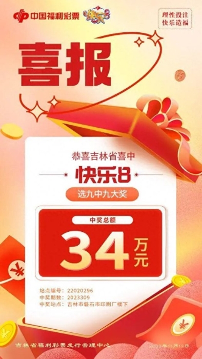 11月19日,福彩快乐8游戏第2023309期开奖,全国共爆出4注“快乐8-选九中九”大奖,单注奖金30万元。吉林省磐石市印刷厂楼下第22020296号福彩投注站“20人合买团”凭借一张“选九11码”复式票,合力揽获其中1注“快乐8-选九中九”大奖,票面总奖金34万元!