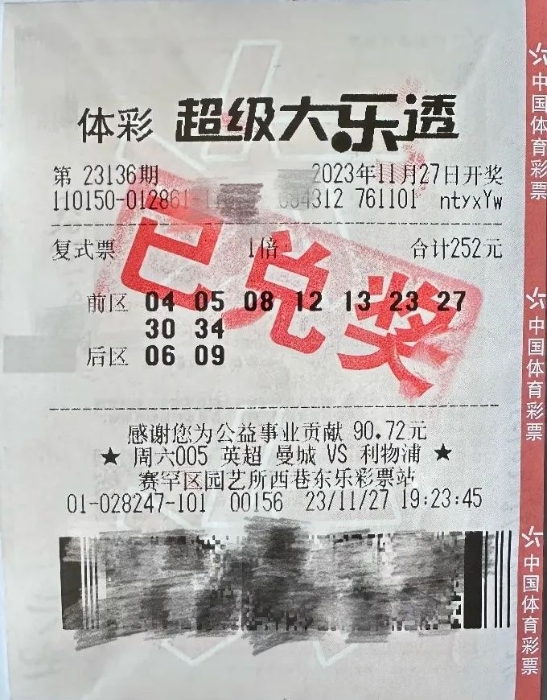 11月27日,体彩超级大乐透第23136期前区开出号码“13、23、27、30、34”,后区开出号码“06、09”,我区呼和浩特市1501028247实体店传出喜讯。