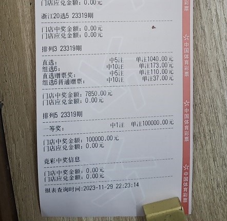 11月29日晚,体彩“排列5”第23319期开奖,开出中奖号码为“9、6、5、9、8”。位于杭州拱墅区体育场路49号的3301002540体彩实体店传来好消息,一位幸运购彩者中得 “排列5”一等奖 1注,“排列3”中直选5注和组选10注,由于正值“排列3”2000万元大派送活动,加上赠票,购彩者共计获得奖金107850元。